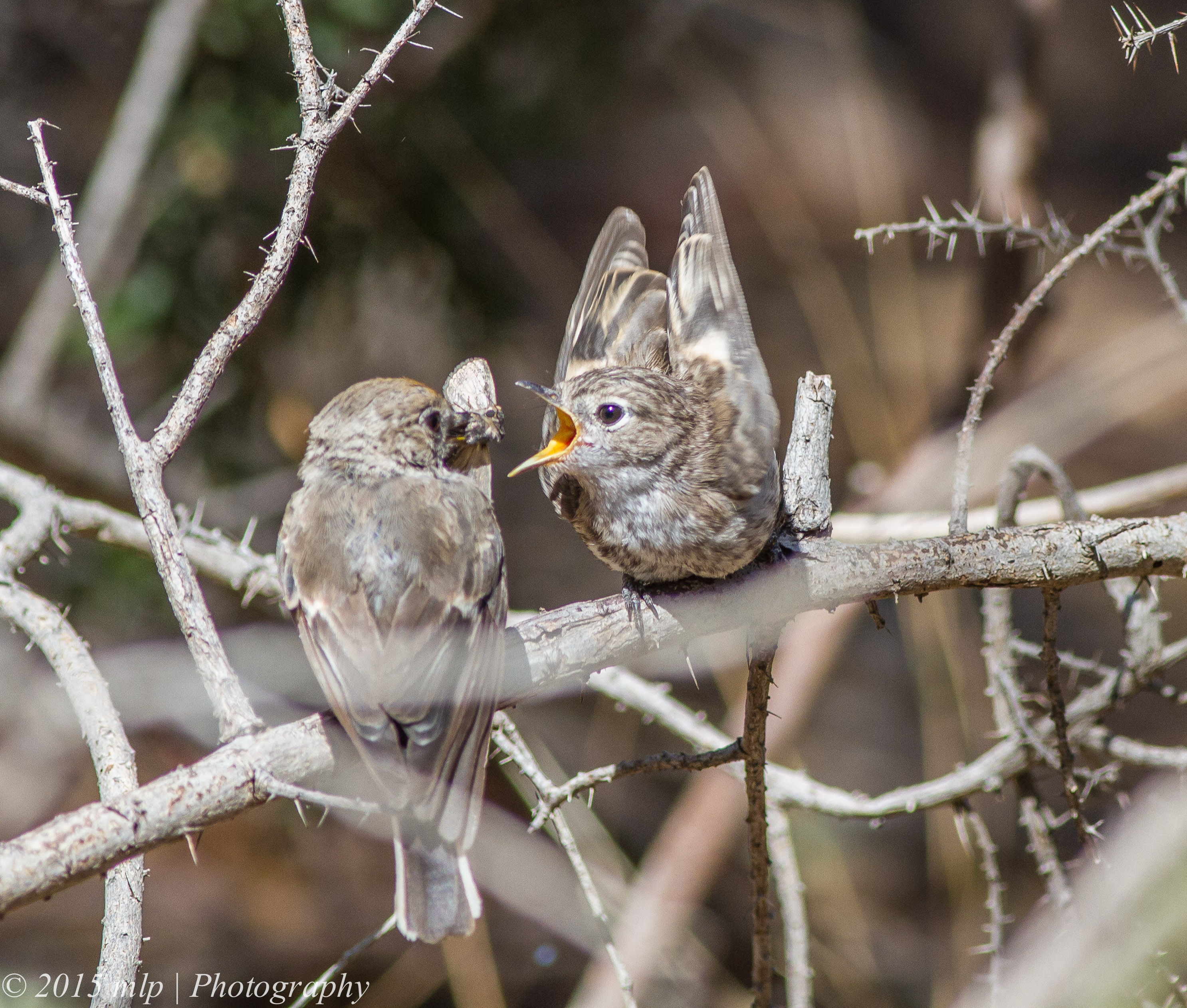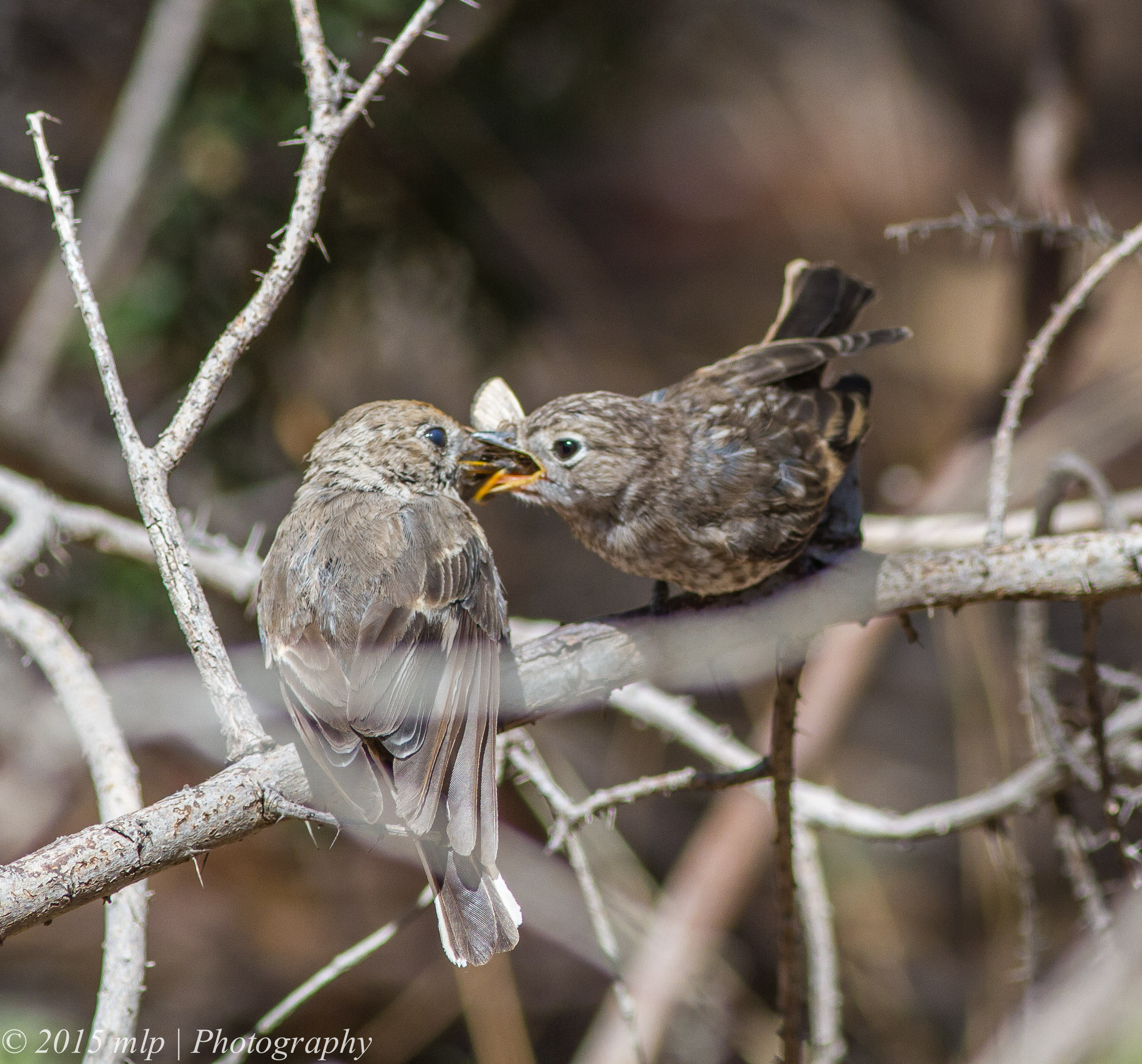 While I was trying to figure out what was happening with the Red-Capped Robins and their strange rituals I did notice that they would break off now and again and start to hunt for insects on the ground. The male would hunt and eat his prize while the female would fly off and into a dense bit of prickly scrub. I slowly followed her over to the scrub and stood next to a tree trying to blend in and look to see if she was returning to a nest. I found a little juvenile Red Capped Robin in the scrub. I watched the chick for a while and soon picked up that he knew when mum was coming back before I did. I kept the camera on the chick and waited for the usual reactions.