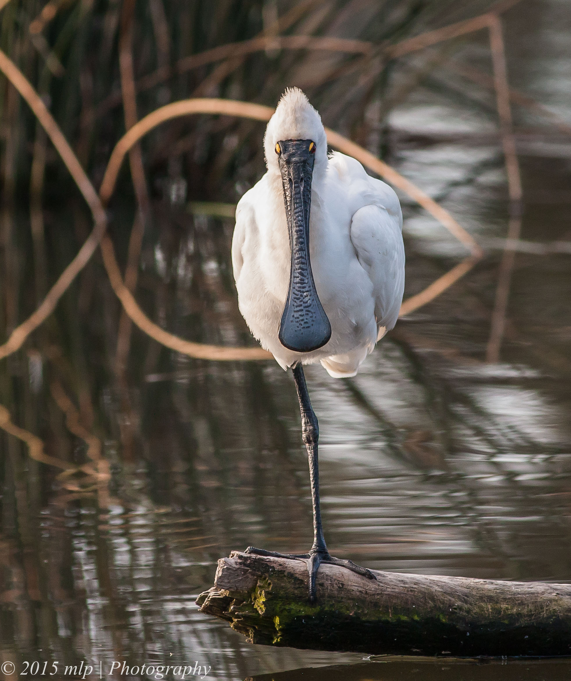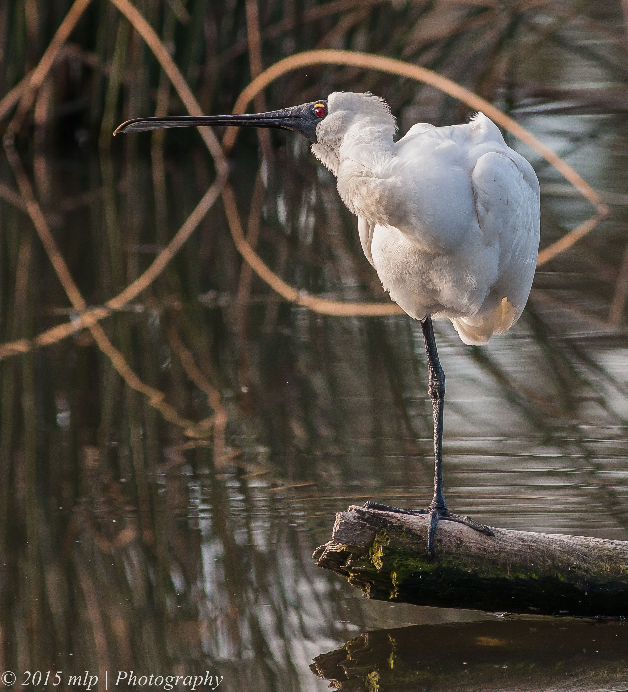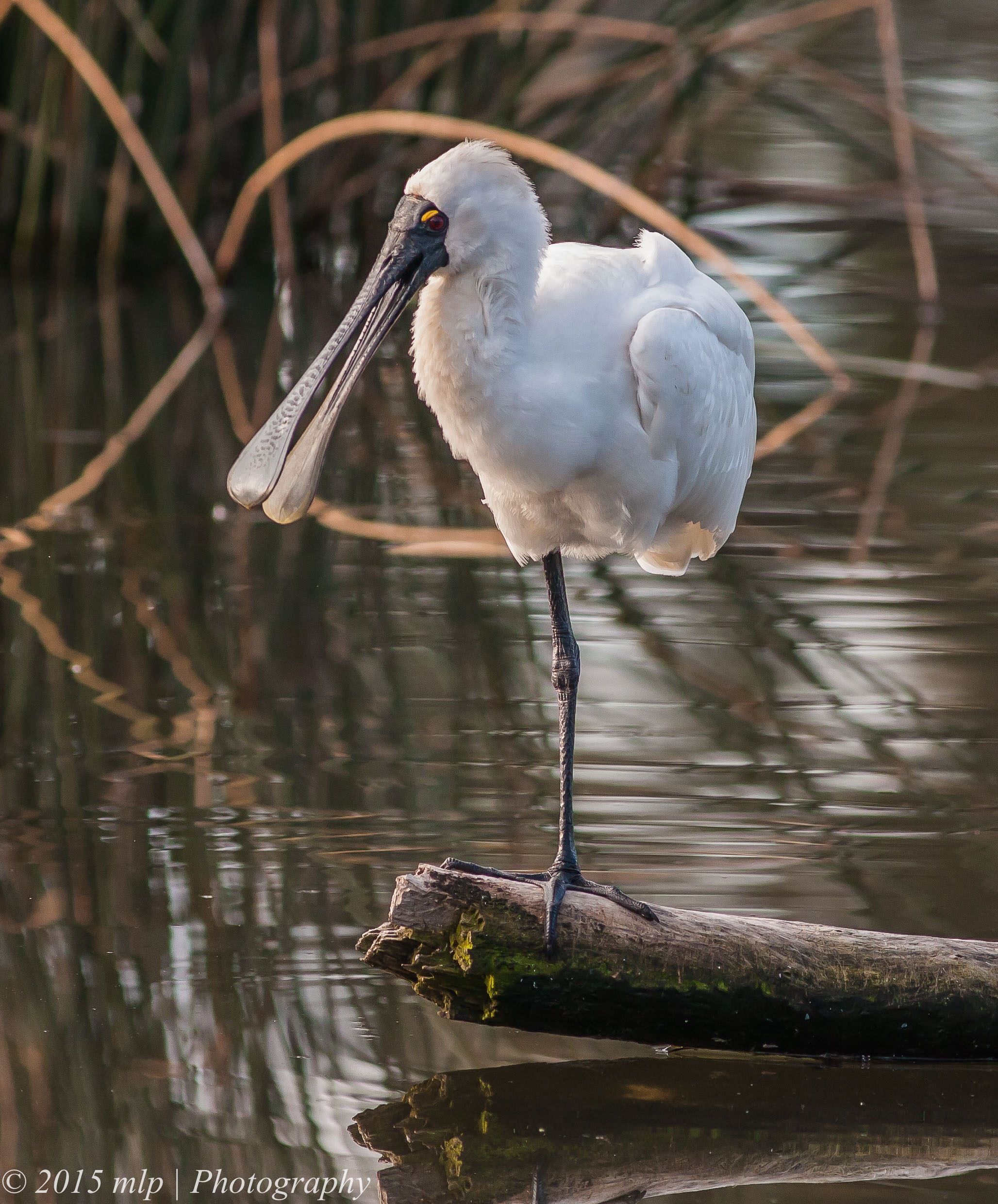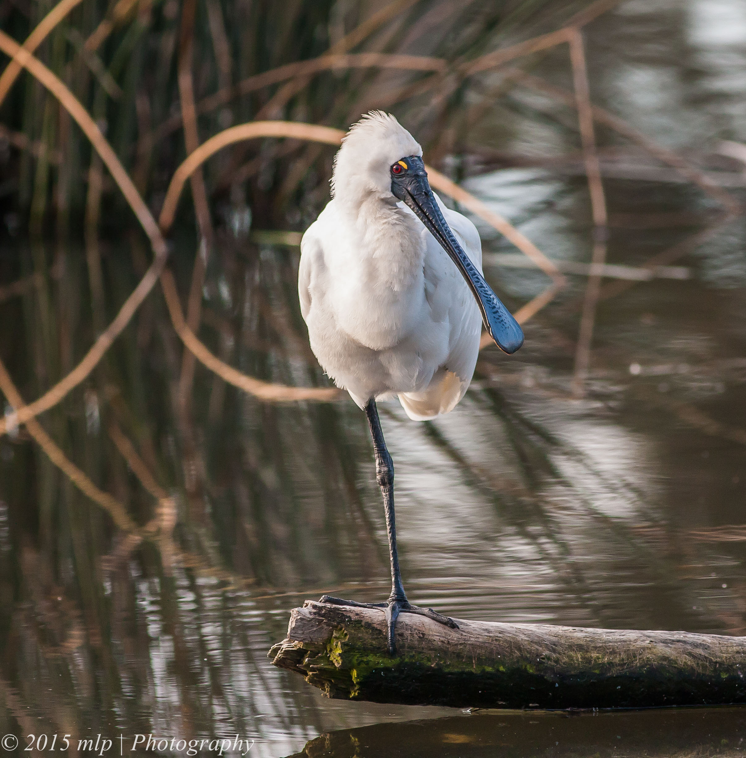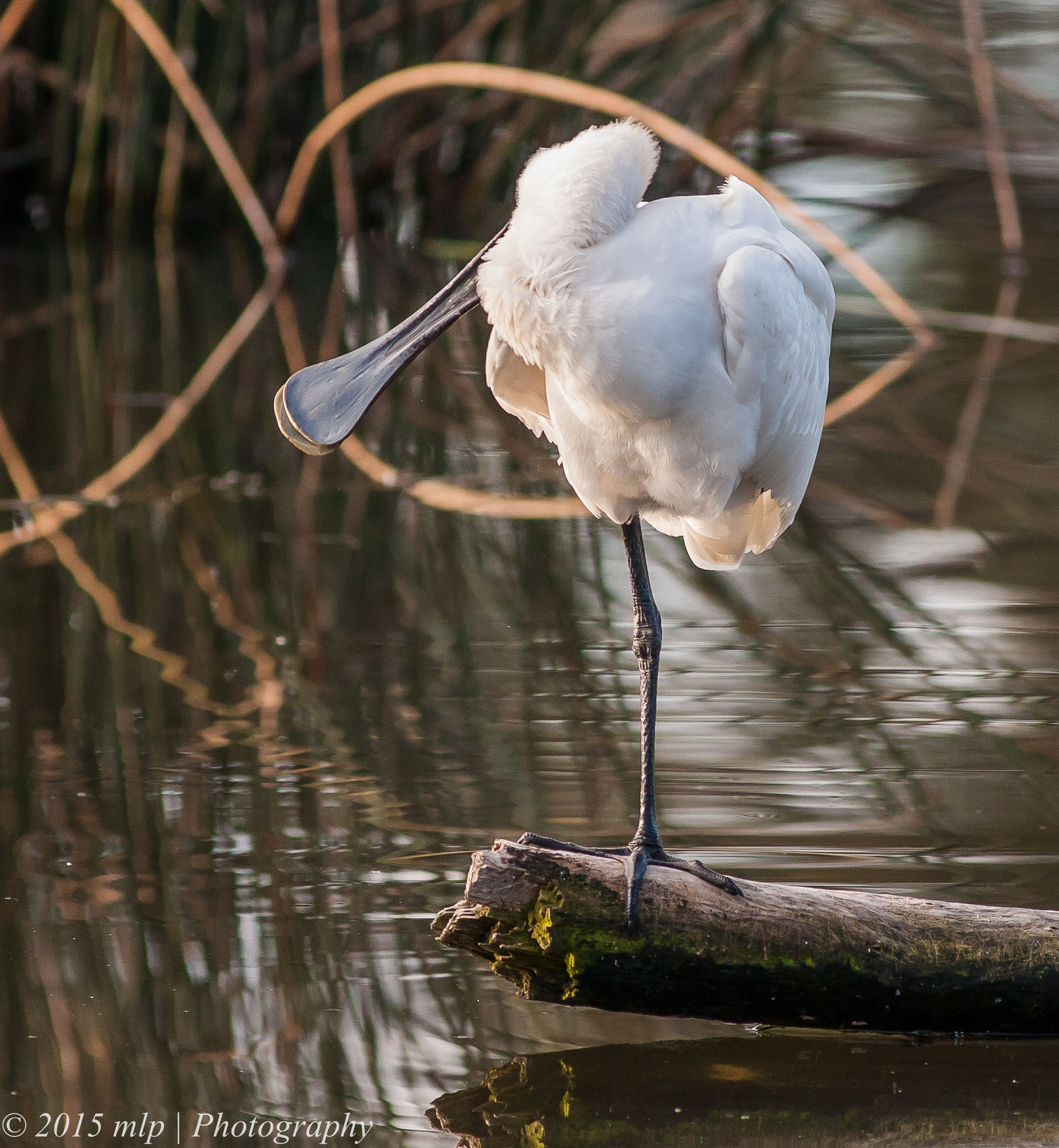 Only once before have I seen a Royal Spoonbill roosting at the Elster Creek lake in the golf course. On a recent sunny Winter’s day I walked along the creek doing my rounds and I noticed a large pure white bird taking a nap on a log. It was larger than the local Egret. I spent some time quietly watching the Spoonbill and taking a few shots. The bird stretched, yawned, swapped legs and generally napped. The Spoonbill gave me a good look at the bill and how well it is designed for working in the sand and mud. It uses the bill in the water and down to the sandy bottom (40cm or so)  and hunts for shrimp and in freshwater mud it looks for small fish. It uses a side to side motion until something hits the sensitive part and is quickly scooped up.  It was the first time I got a good close look at the Royal Spoonbill and they have a remarkable face and bill and the toes impressed me as well. I have not noticed how big and versatile they are. Another bird I can add to the local birds list
