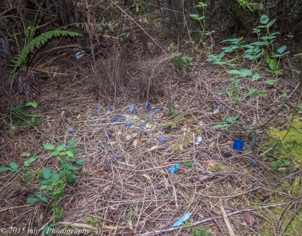 While looking around the forest near the waterfall I found a partially constructed Bower from a Satin Bowerbird – immediately identifiable from the shape and the pile of blue objects collected by the Satin Bowerbird. The bower area was probably from last year, the bower was being rebuilt and the blue objects collected by the Bowerbird for impressing the ladies were still covered by weeds and vines.