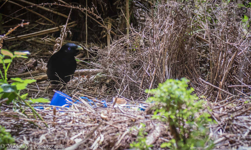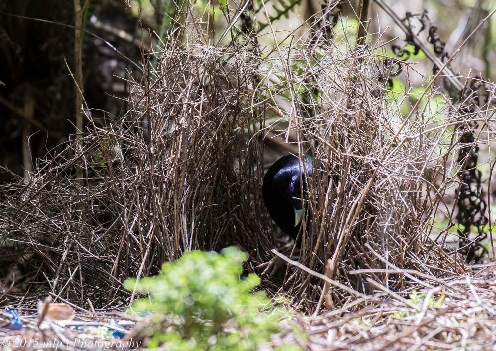 Two days later I found the owner of the Bower moving his blue treasures about for the best placement, and working on his bower. The Satin Bowerbird is a beautiful shiny black bird with amazing purple eyes.