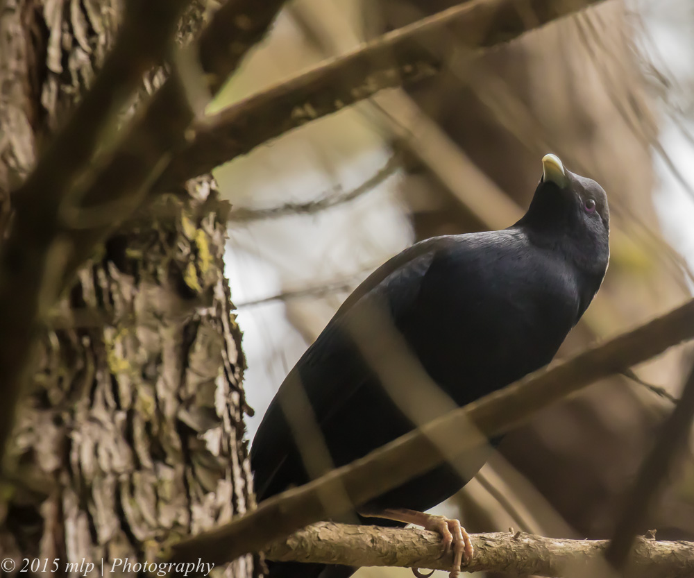 I had setup my camera and tripod about 10 metres away behind a large pine tree. After a few minutes I lost sight of the Bowerbird and sat back to fight off the ants and mosquitos and realised that the bird was above me watching. He was assessing whether I should be avoided. He watched for a while and then decided I was harmless and went back to the bower to continue his work. (We all try to impress the ladies in our own way).
