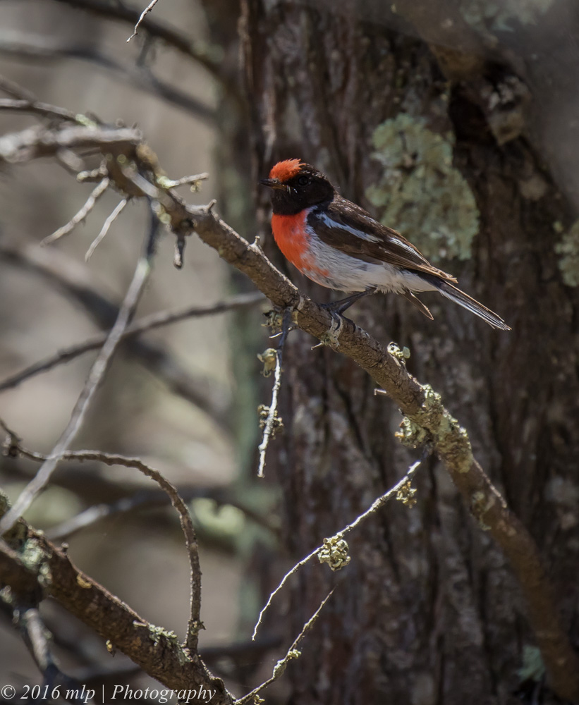 On a drive around the Little Desert National Park as part of my compass tour of Vic, I stopped and walked through a copse of pine trees looking for anything that might be out in the heat. I found a group of small robins and followed them for a while trying get a clear shot through the branches. A male Red-capped Robin finally popped into view. The robins are like little raptors, they perch on a branch and when they spot something they pounce down and catch the prey. If you stand still for a while they just ignore you and you can get quite close.