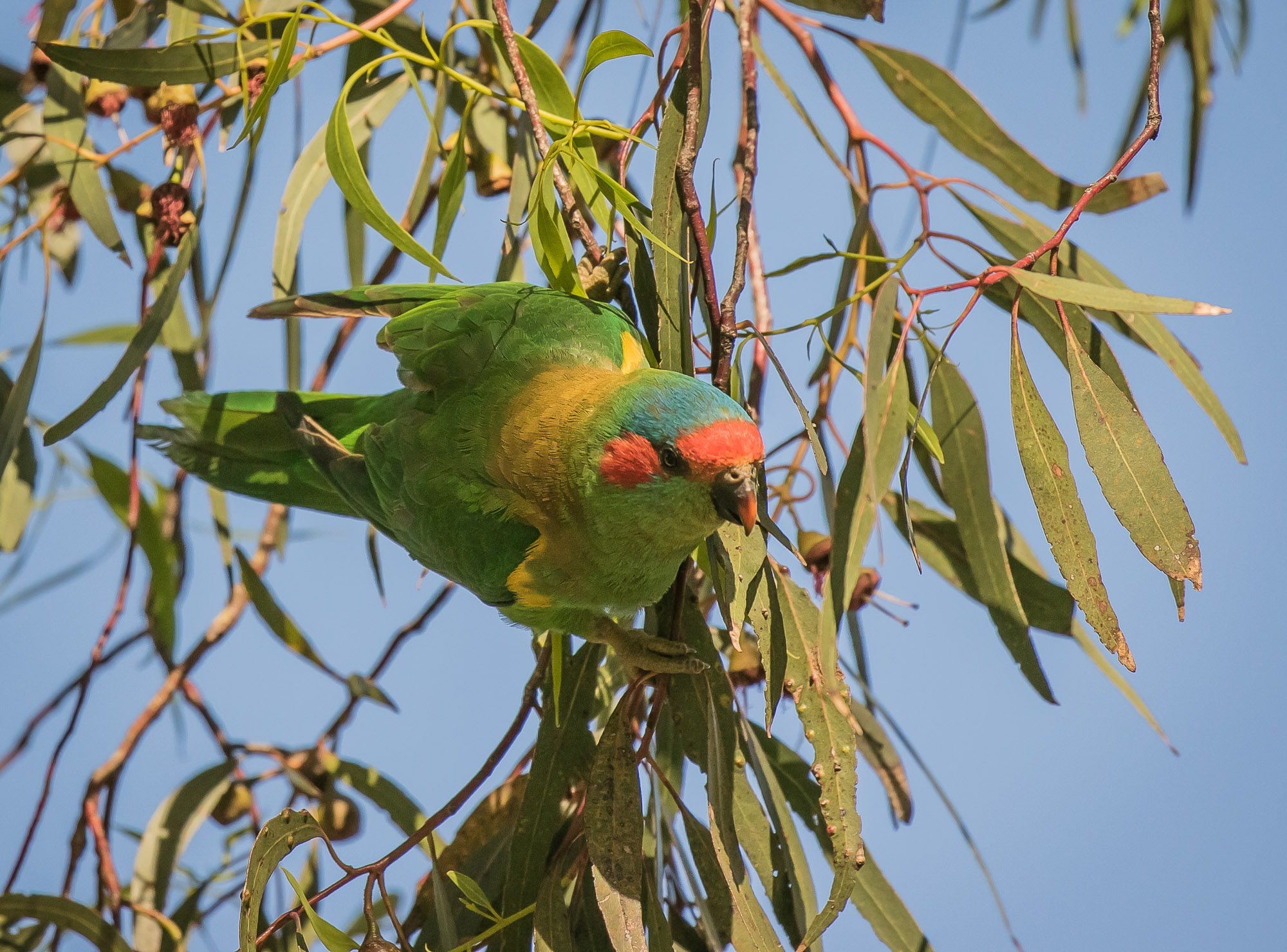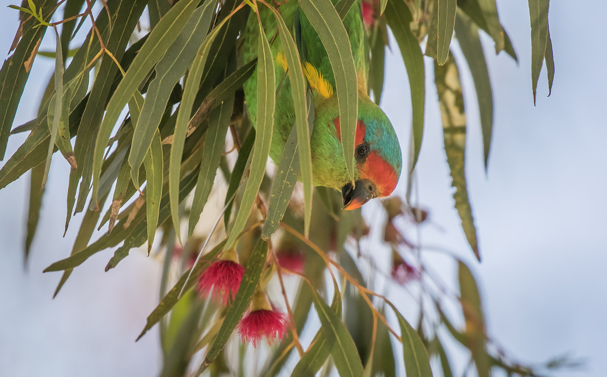 When the Eucalypts start flowering in summer the Musk Lorikeets start arriving in good numbers along Elster Creek and in the trees at Elsternwick Lake. Lorikeets are highly mobile and will follow flowering eucalypts all over the state.  The muskies have a distinctly different call to the locally common Rainbow Lorikeet.  I walked over to the lake on the weekend with a birding friend and we followed our ears to the red flowering gums. A few of the Muskies were low enough to photograph, most shots were of their typical pose – upside down and head into a flower.