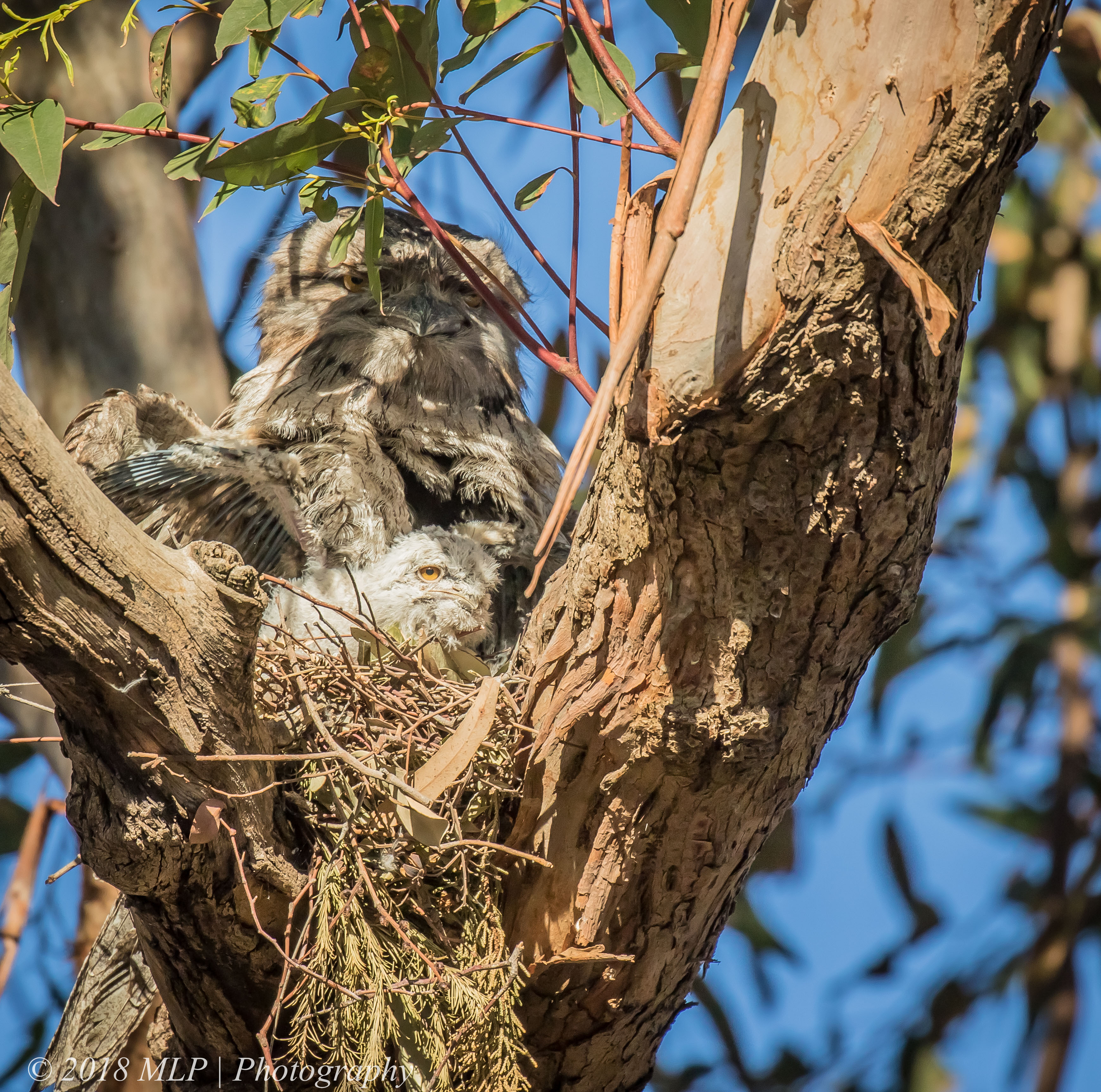 Tawny Frogmouth and chick, Elsternwick Park North, Elsternwick, Vic