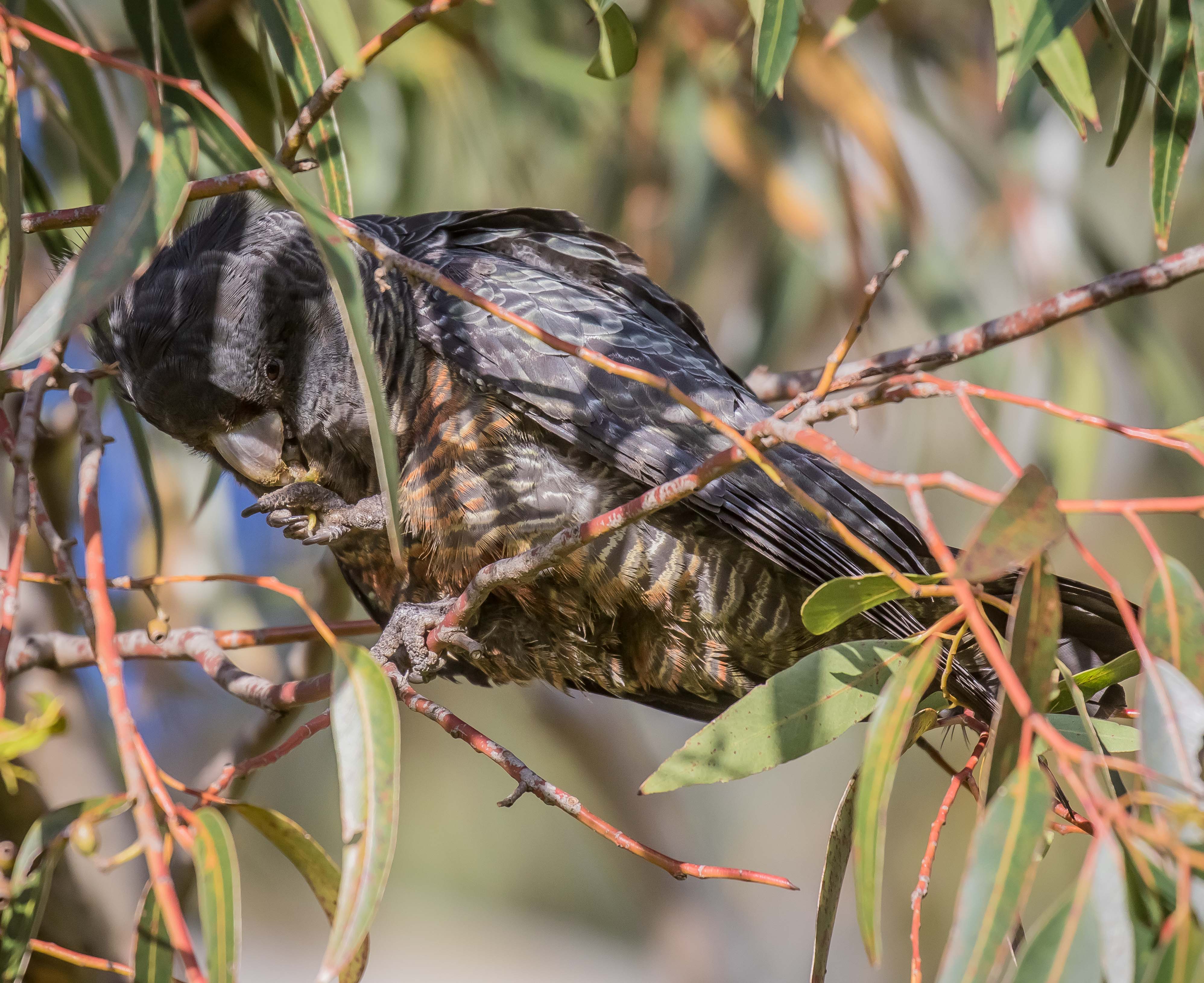 A flock of Gang-gang Cockatoos have been seen throughout the local suburbs, visiting parks and looking for food. They are usually found around inland mountain forests not along bayside beach suburbs. While walking my dog, I found four in a tall gum tree along the creek behind my house. They were squabbling with the local Magpies and Currawongs. I rushed home to get my camera gear to see if I could get a few shots of my first local sighting and only my third sighting in the last 10 years.  The flock had moved on but I did find a lone female Gang-gang feeding on green seed pods in the lower branch of a large tree at the other side of the old golf course. I watched for a while as she ate green seeds and then napped briefly, roused and ate more. After 30 mins or so the other members of her flock flew along the creek calling, she joined them and they headed further down the coast. I have not seen them since.