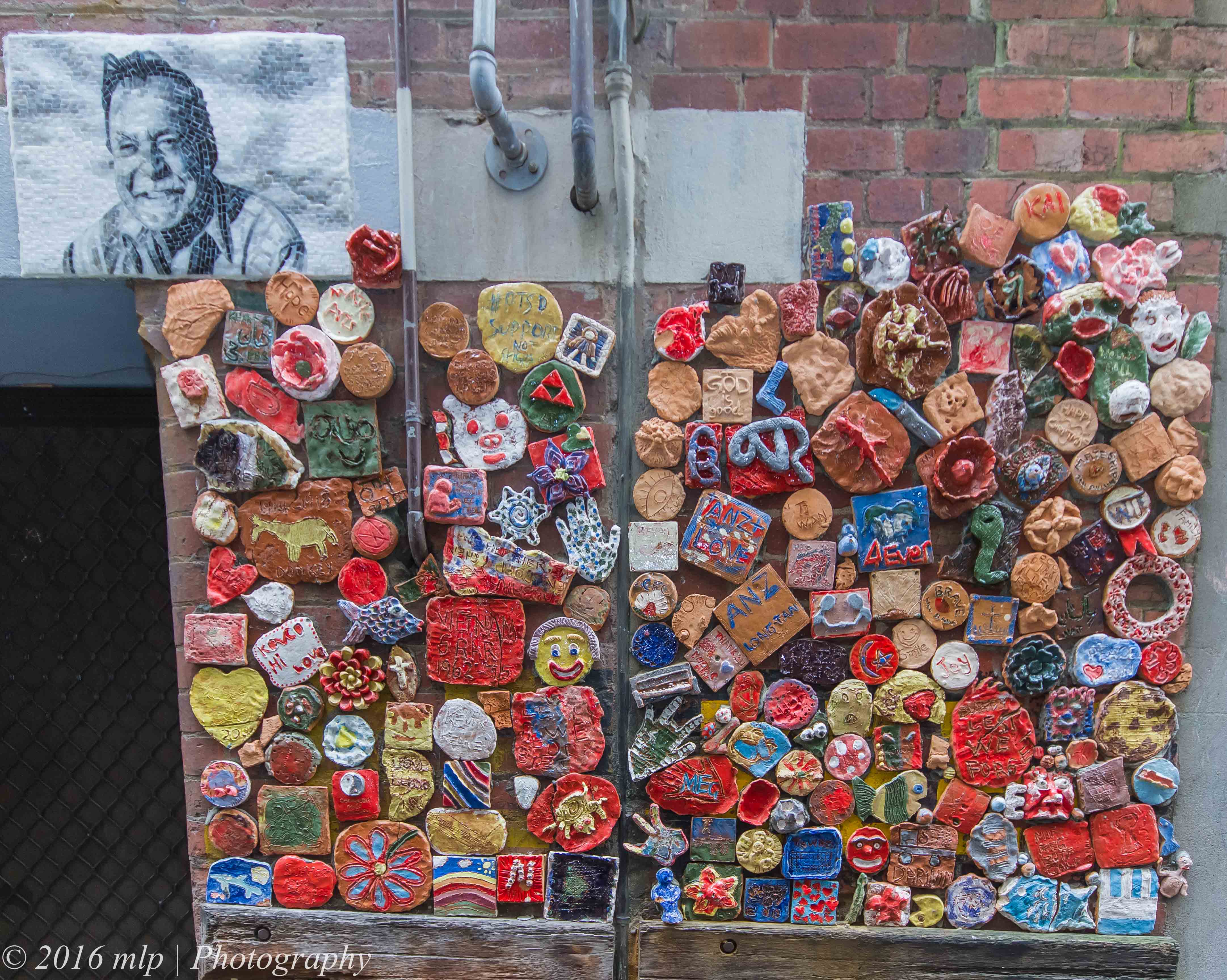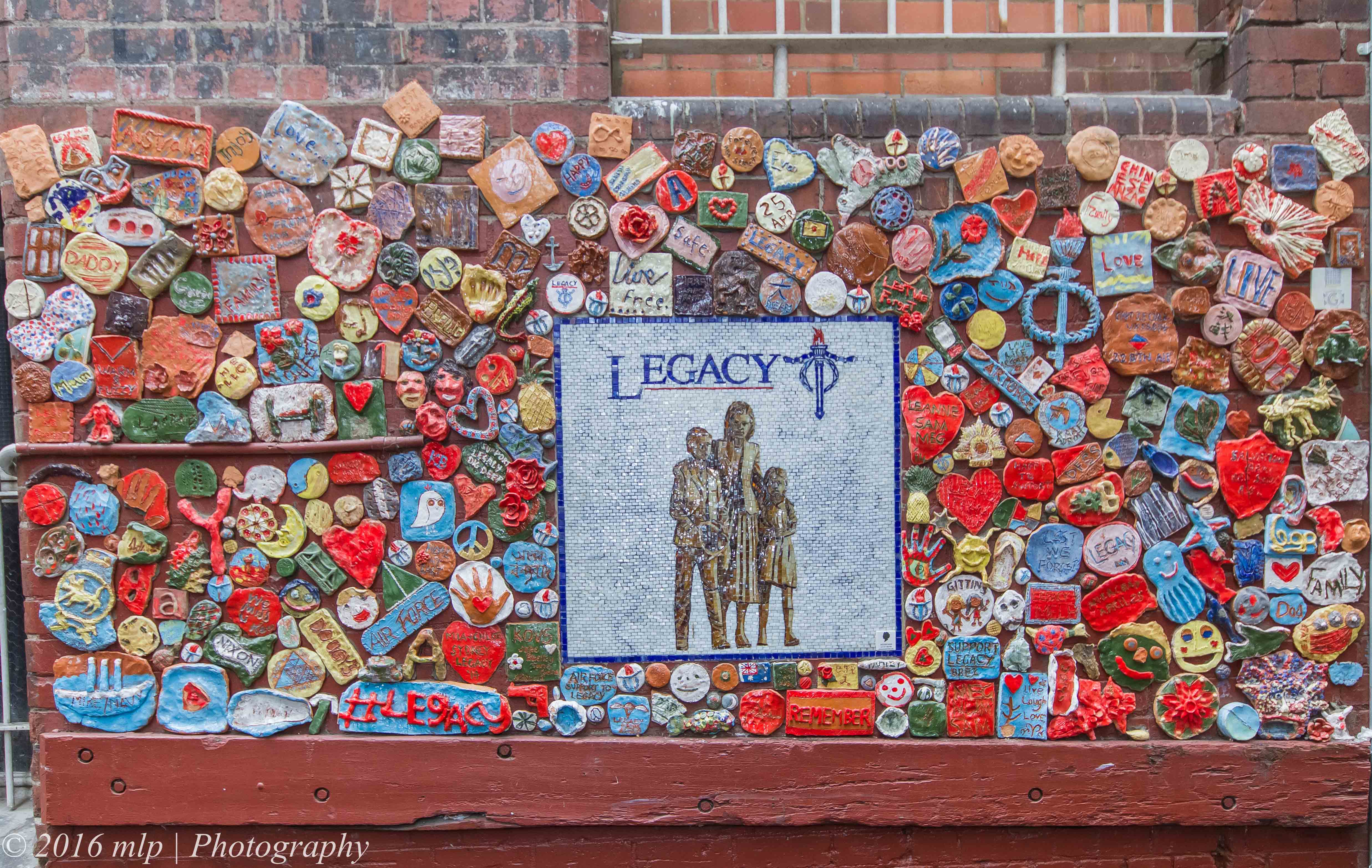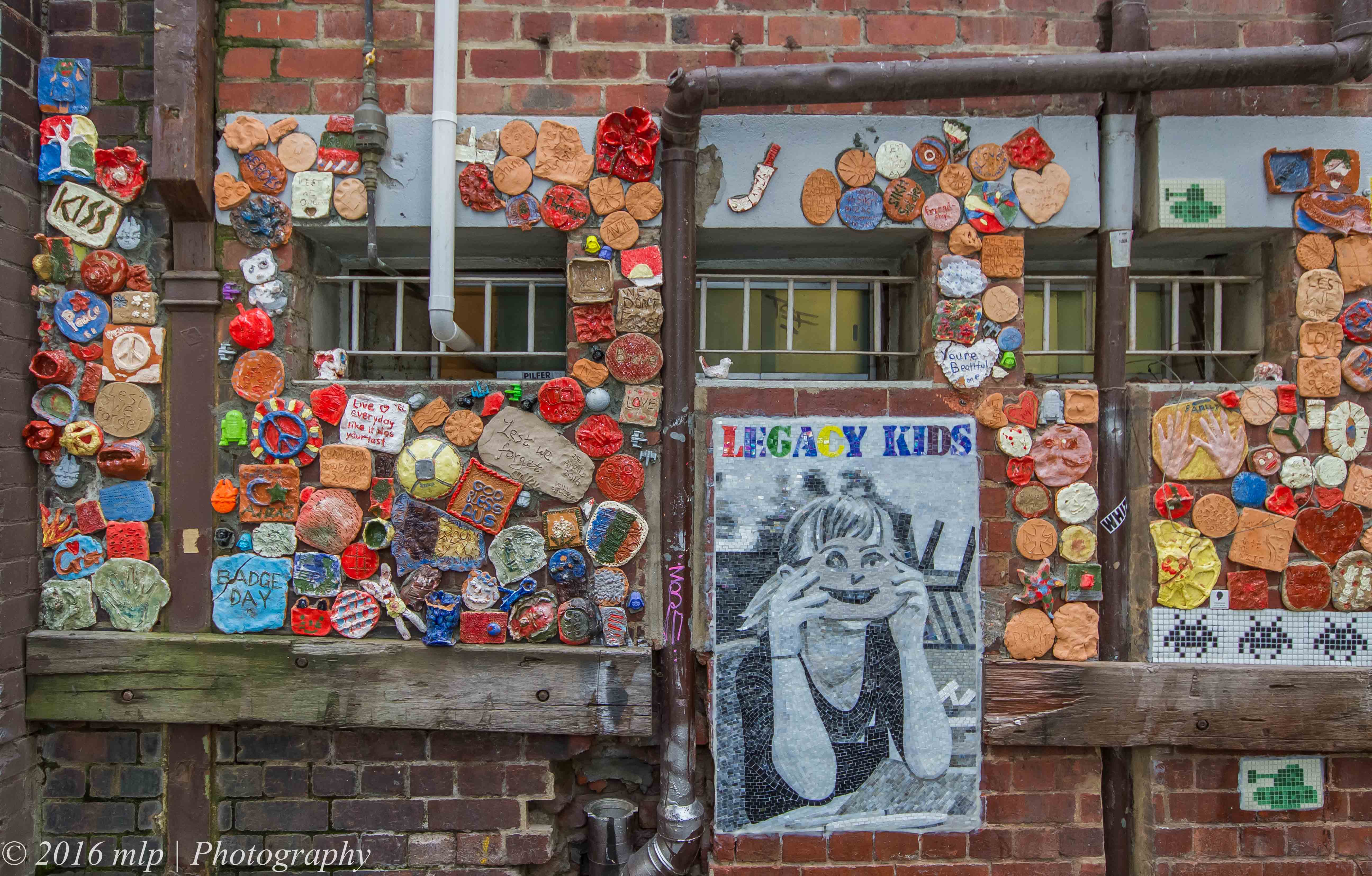 In Drewery Lane at the rear of Legacy House, a special project has been slowly developing over the last few years. A mosaic artist, Sankar Nadeson, has been creating long walls of ceramic tiles and mosiacs. Sankar is a skilled mosaic artist, tiler and teacher. He has been working with schools and various art programs to teach people how to make ceramic tiles and then putting them up onto the walls of Drewery Lane. The theme of the art work has been Legacy. Legacy is a charity organisation that supports families of defence force personnel who have been injured or killed. Many of the tiles below were made by kids with strong ties to the defence forces.