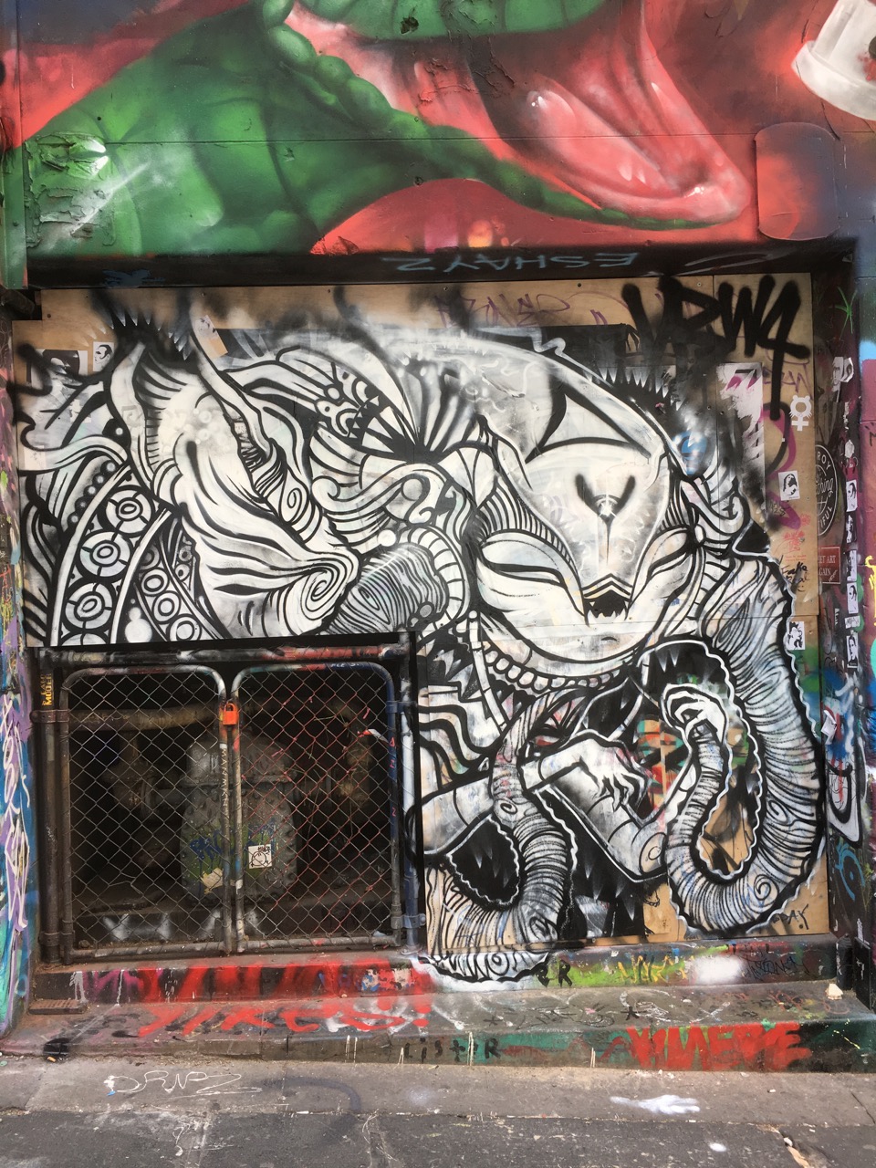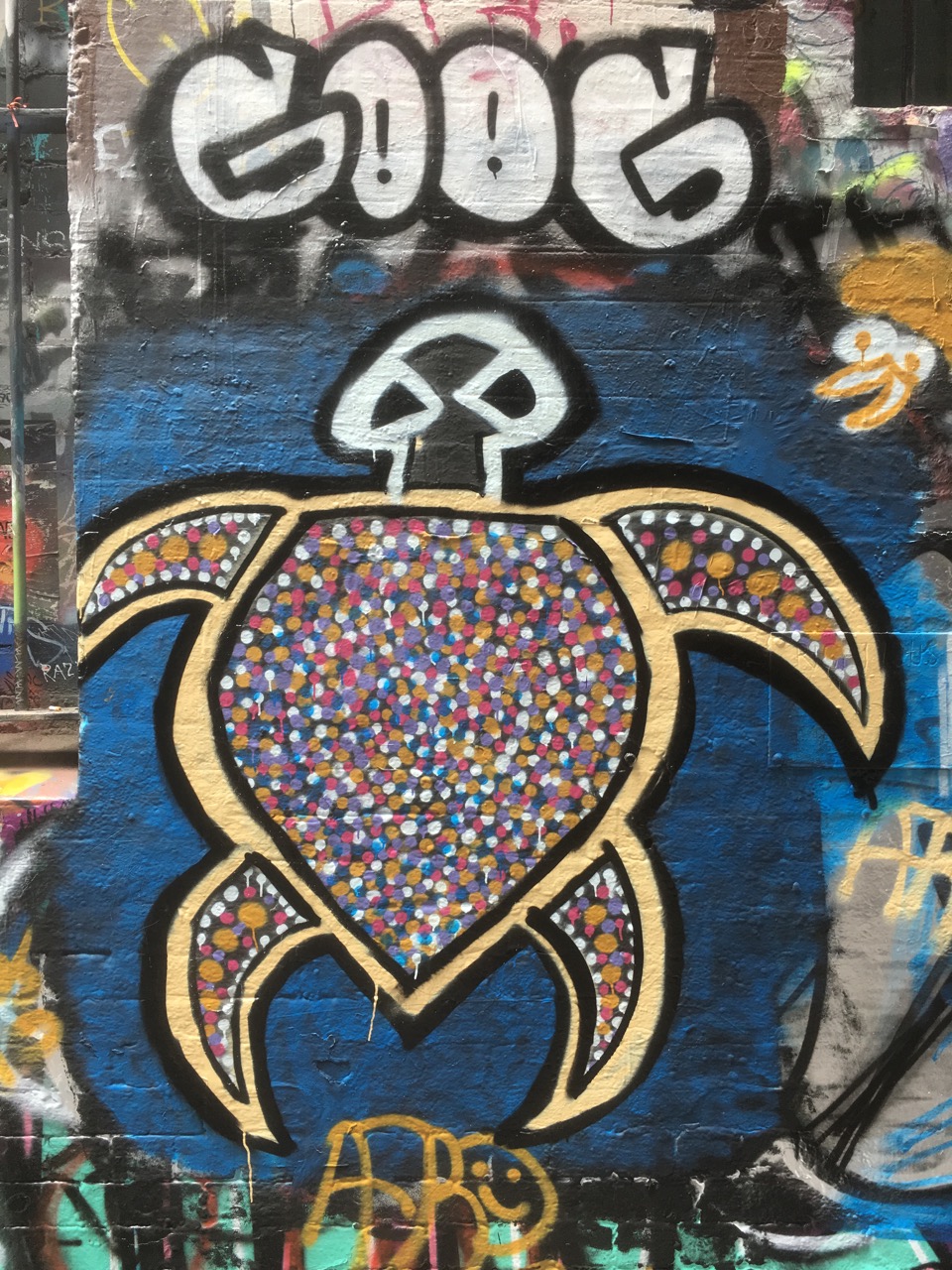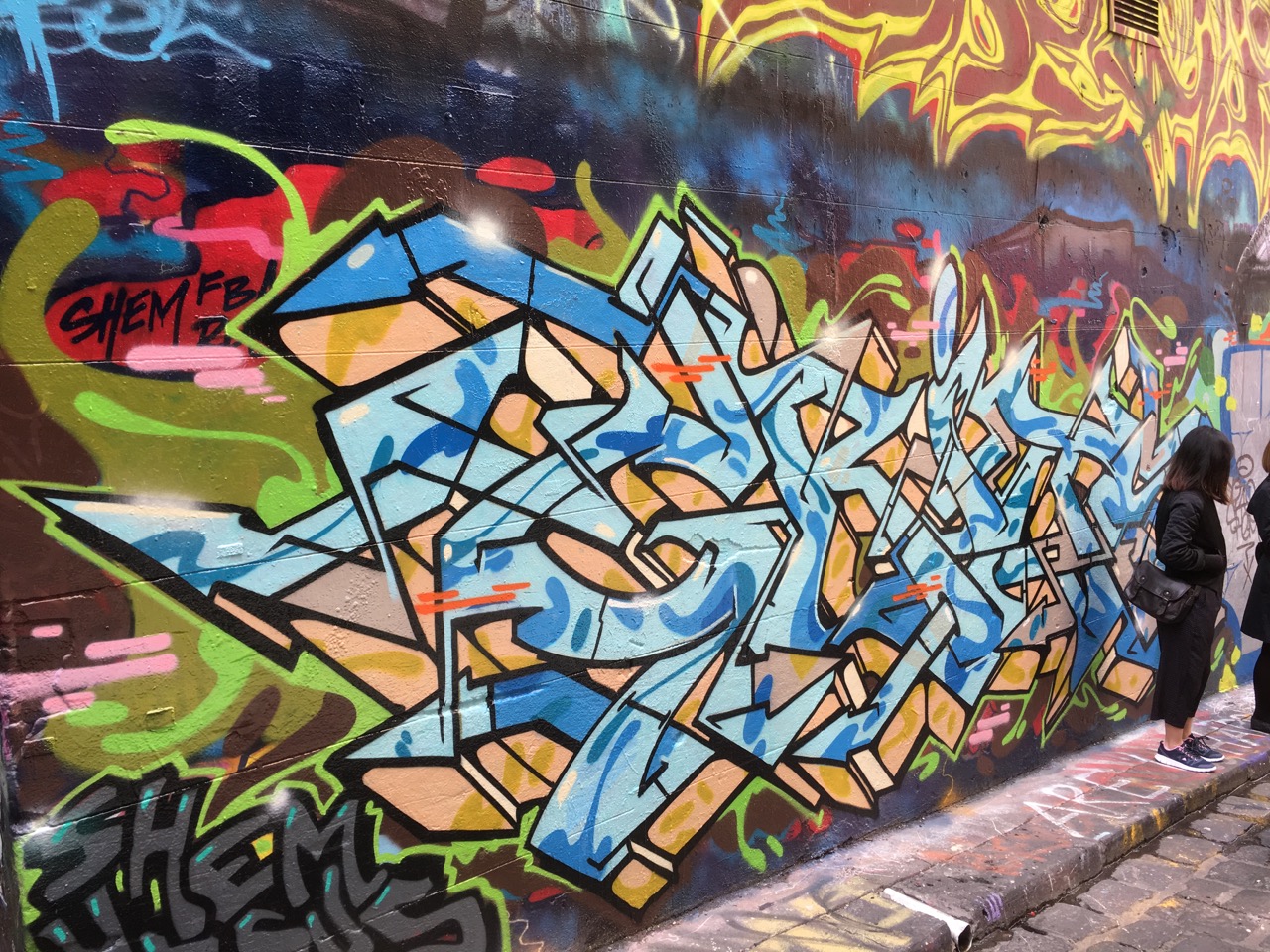 Another great street art laneway, Flinders Crt is located near the Elizabeth St entrance of Flinders St Train Station. It has some large interesting pieces with vivid colours. A recent council project has seen the whole laneway repainted by local artists. Talking to one of the organisers, it is part of an initiative to keep the laneways active and a vibrant part of the visitors experience  – it also has an interesting byproduct of keeping the less desirable aspects (alcohol and drugs abuse culture) of a large city minimised.