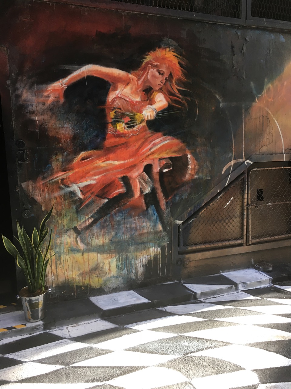 A walk through a narrow laneway: Flanigan Lane, in the Melbourne CBD,  and a nice surprise, a very large mural of a Blues guitarist…
