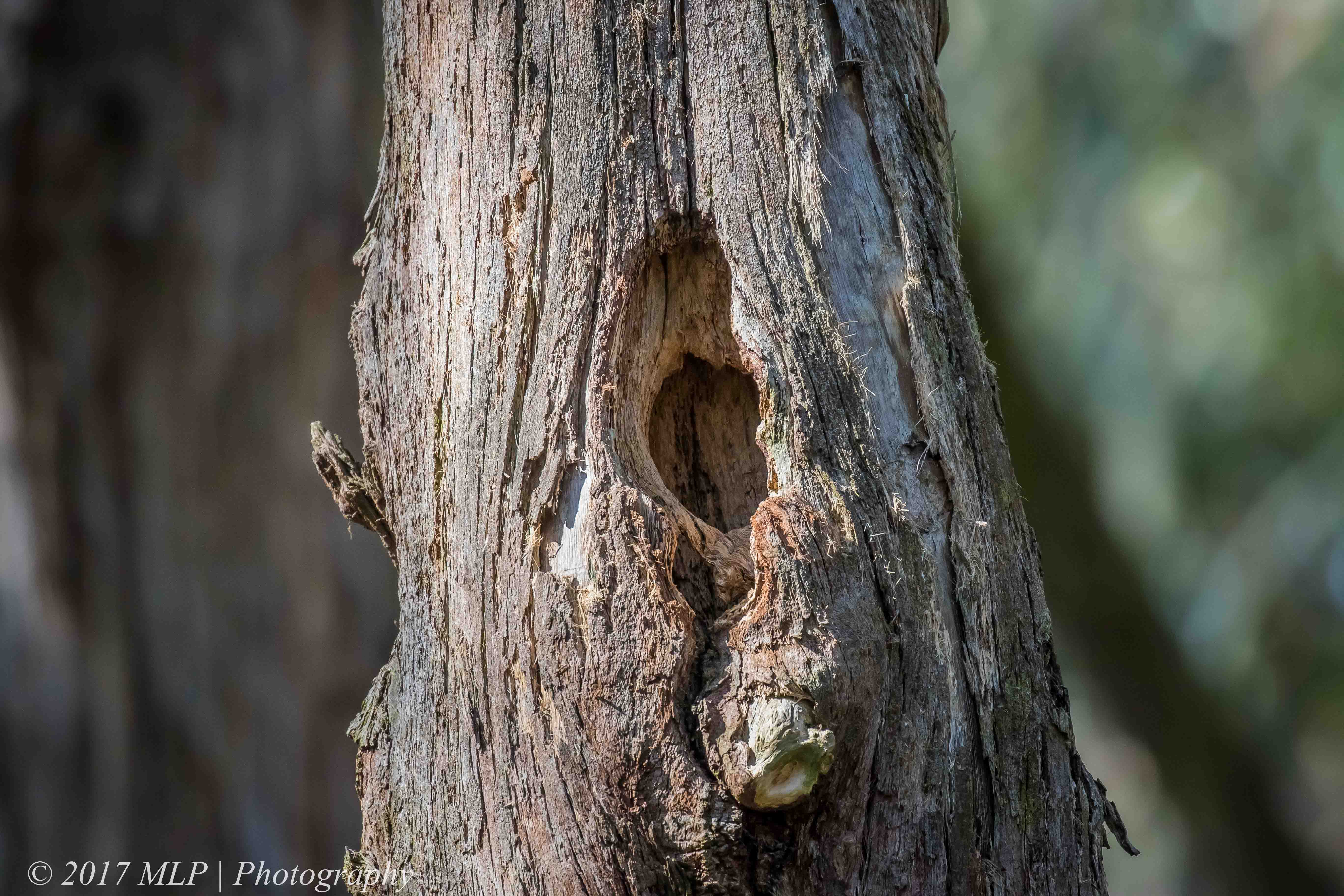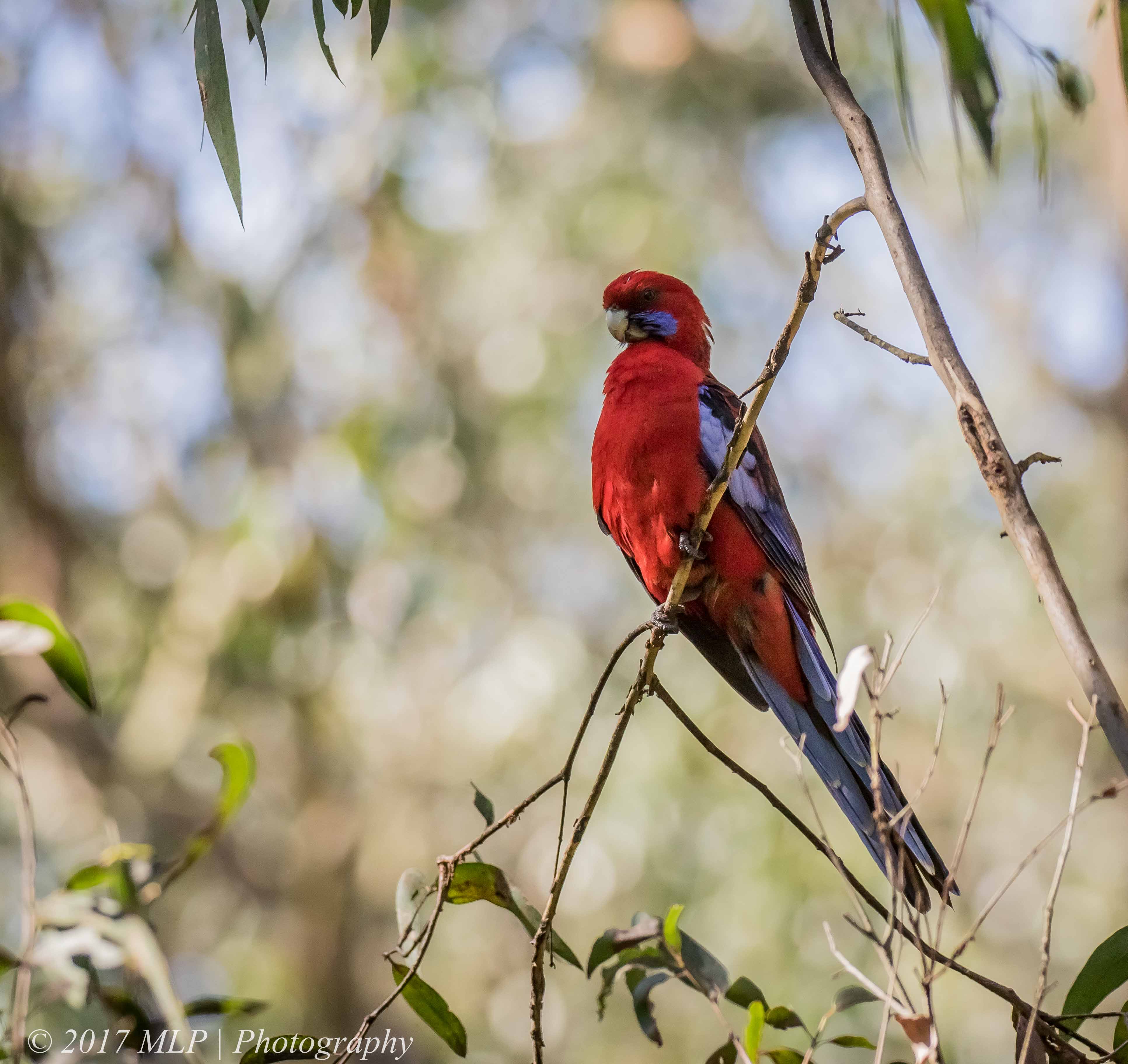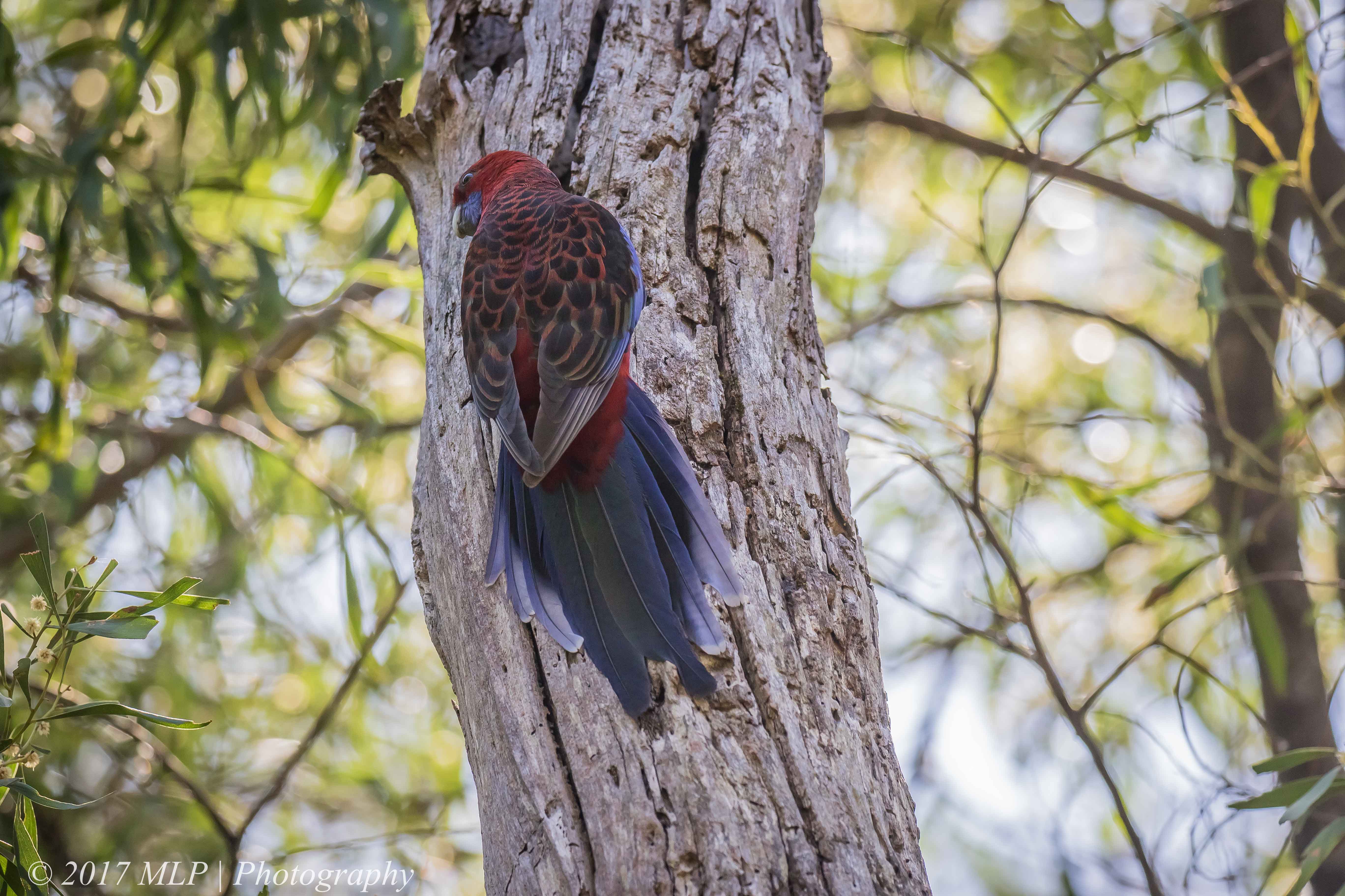 While walking around my usual Green’s Bush circuit I noticed many Crimson Rosellas exploring every tree hollow on the older growth Eucalypts. A few went right inside the various cavities after a cursory glance, and several flew off quickly when an occupant was discovered (most likely a brush tailed possum or sugar glider). I found a pair really giving this hollow a thorough inspection. One did all the inspecting while the other stood guard on a nearby branch – he spent the time watching me on the trail and shaking his tail feathers now and again and quietly squawking. I assumed the other took this as a signal to be alert but not alarmed.