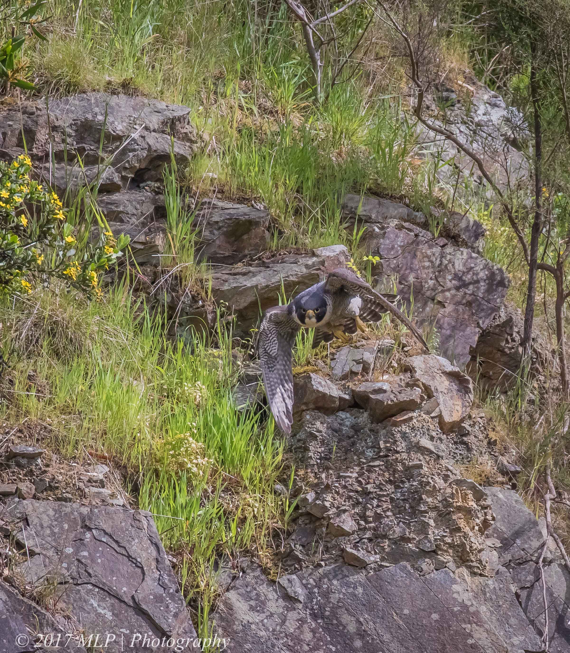 On my last visit to Moorooduc Quarry I watched as the Peregrines flew across the water and retrieved cached food. One of the falcons flew to a ledge where I suspected it had chicks. I returned to the quarry on Tuesday afternoon and immediately spotted two good size Falcons standing on the ledge watching me. At first I thought they were adults due to their size but on viewing with my binocs I saw the mottled colouring and realised that they were juvenile falcons. I spent some time watching them and then thought about where the parents might be. I turned around to look up at the quarry cliffs and the tall trees and behind me found an adult just staring at me. It soon lost interest as I was too far away to be a threat to it or its chicks. Looking further around the rim I found the other parent high up on a tall gum keeping guard. Four Peregrines in one site visit! – you can’t get much better than that…I am looking forward to dropping in again soon to watch their progress and early flights.