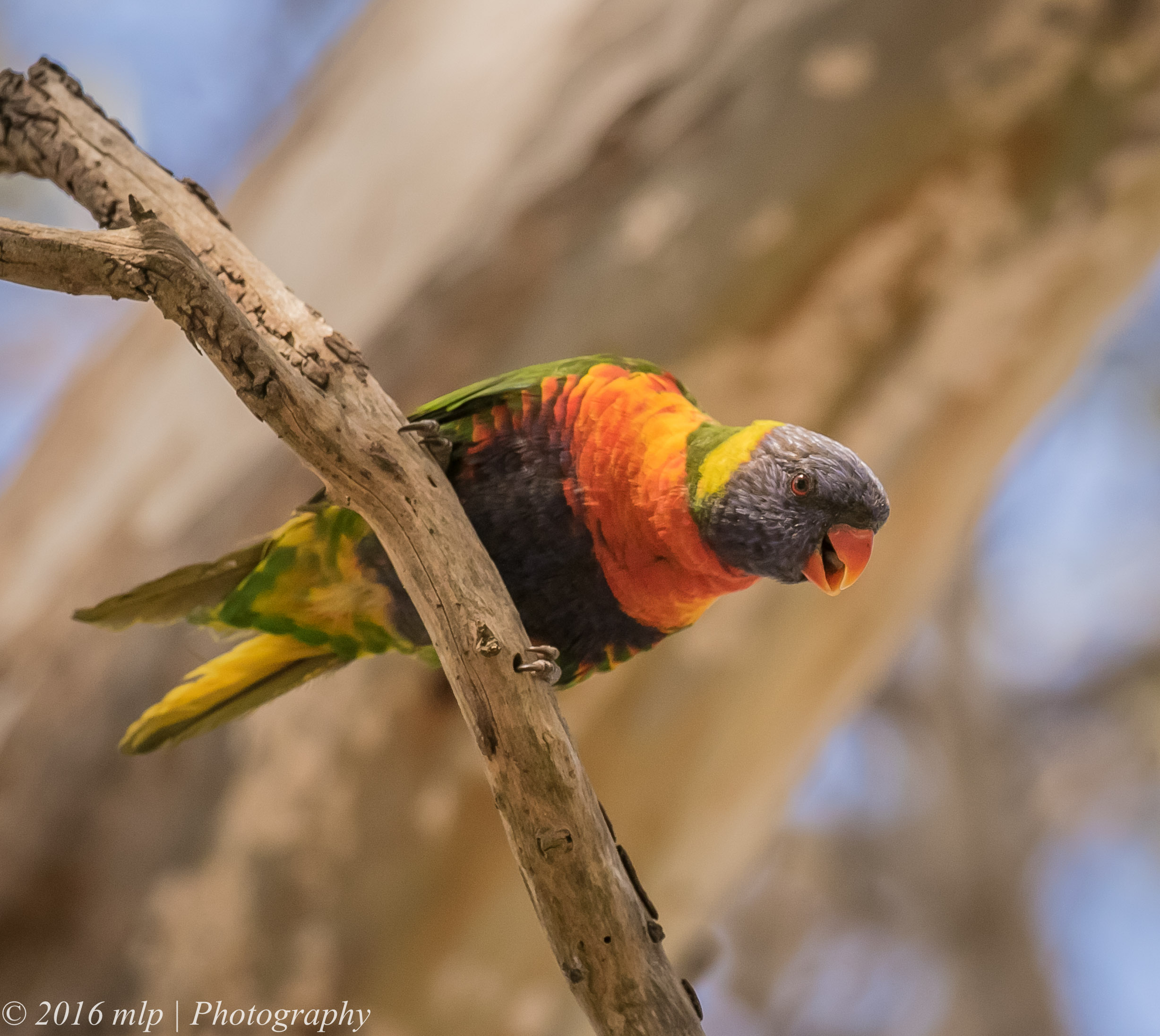 And when it comes to colourful birds there aren’t many, if any, in my area that can beat a Rainbow Lorikeet. They are a gregarious species that have become the main parrot of the Melbourne Suburbs. Not that many years ago they were found  further out in the country-side but the last big 12 year drought ended a few years ago and the result was an influx of birds and some decided to stay. The Rainbow Lorikeet has grown in numbers and now can be found in most areas. Even with all the colours, excitable chatter and feeding noises,  once they are quiet and sitting in a gum they are invisible. Their colours are rich underneath but from above are an almost uniform green: good for camouflage and hiding from raptors.