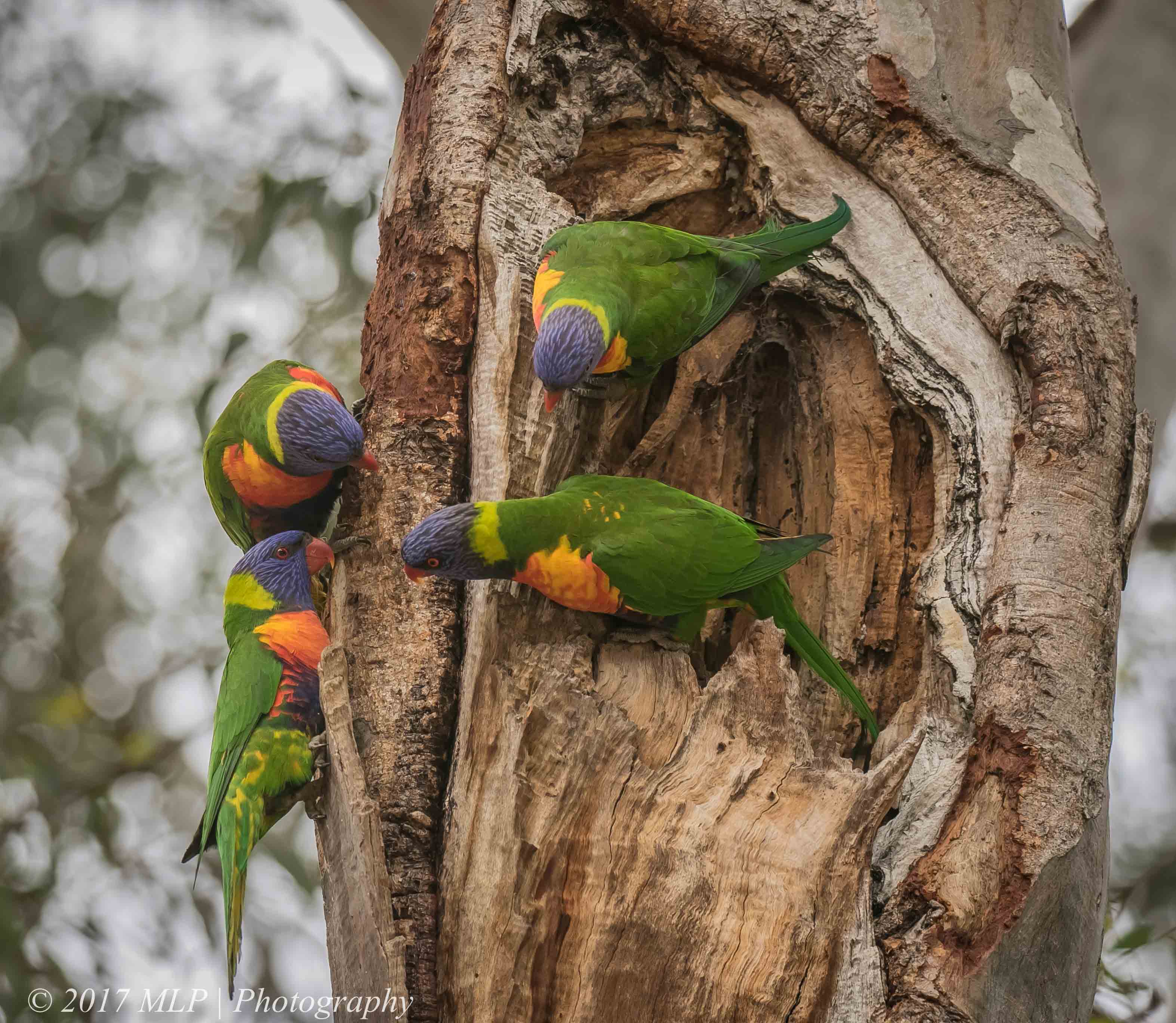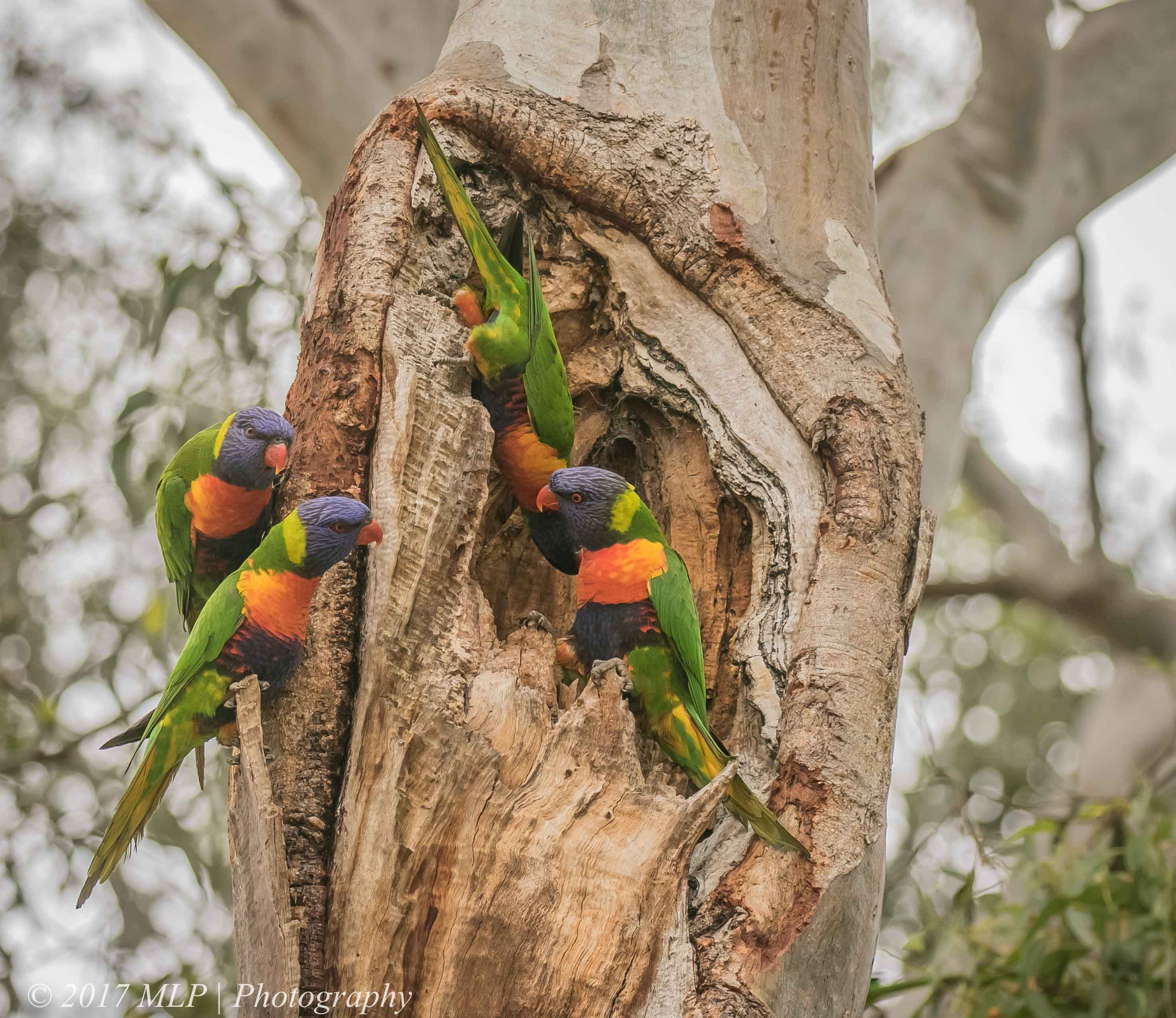 After leaving the car in the Boundary Road carpark at Braeside Park, I could hear quite a few parrots in one of the nearby trees. A great cacophony of squabbling and screeching. The group of four below seemed to be  investigating the tree hollow. I couldn’t tell why – maybe disputing over a potential nest site or food source. They were interesting to watch and photograph as they chewed and tested the dead wood of the hollow. They all seemed to be adults and none were demanding food.  Many more were in the branches above watching and preening.