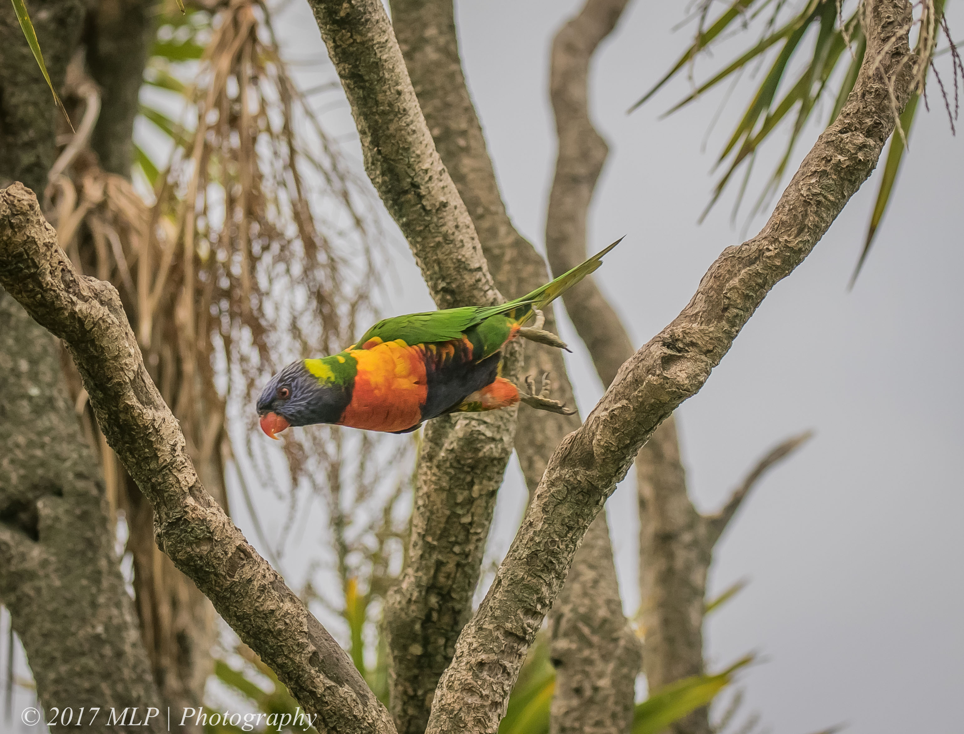 Walking along the local creek last night I stopped to watch a few ducks in the water when a raucous burst of Rainbow Lorikeet sounds from above redirected my attention. Dangling and swinging above me from the end of bent palm tree fronds were two Lorikeets playing and hanging upside down. The competition seemed to be about who could stayed upside down the longest while screeching at each other and me… A number of others watched the action from a nearby power line.